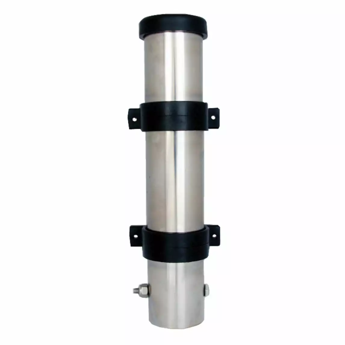 Brushed stainless steel tube with heavy duty, black plastic complete ring mounting saddles. Top opening fitted with black moulded plastic cushion ring to protect rod. 6mm diameter cross bolt in base allows for both standard or gimballed fishing rods.