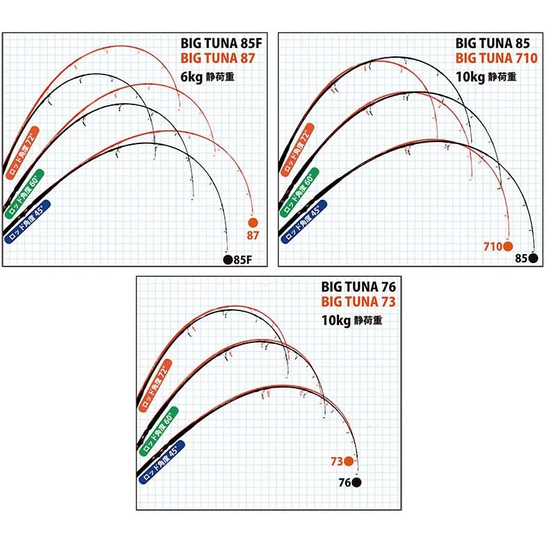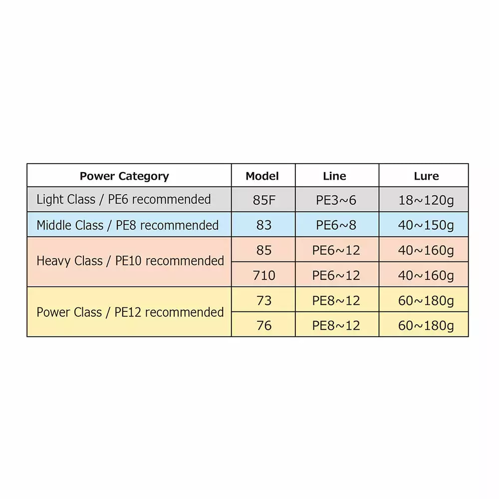 With the ever changing size of tuna and fishing conditions, it has become difficult to chose the most suited rod. So as of 2020 models, we have set the power category as follows in order for a more comprehensive understanding. The 85, 710, 73, 76 are all in the same line max category however the 73 and 76 have been designed with a higher breakage point suited for targeting 200kg class fish which are in a different power category from the 85 and 710.